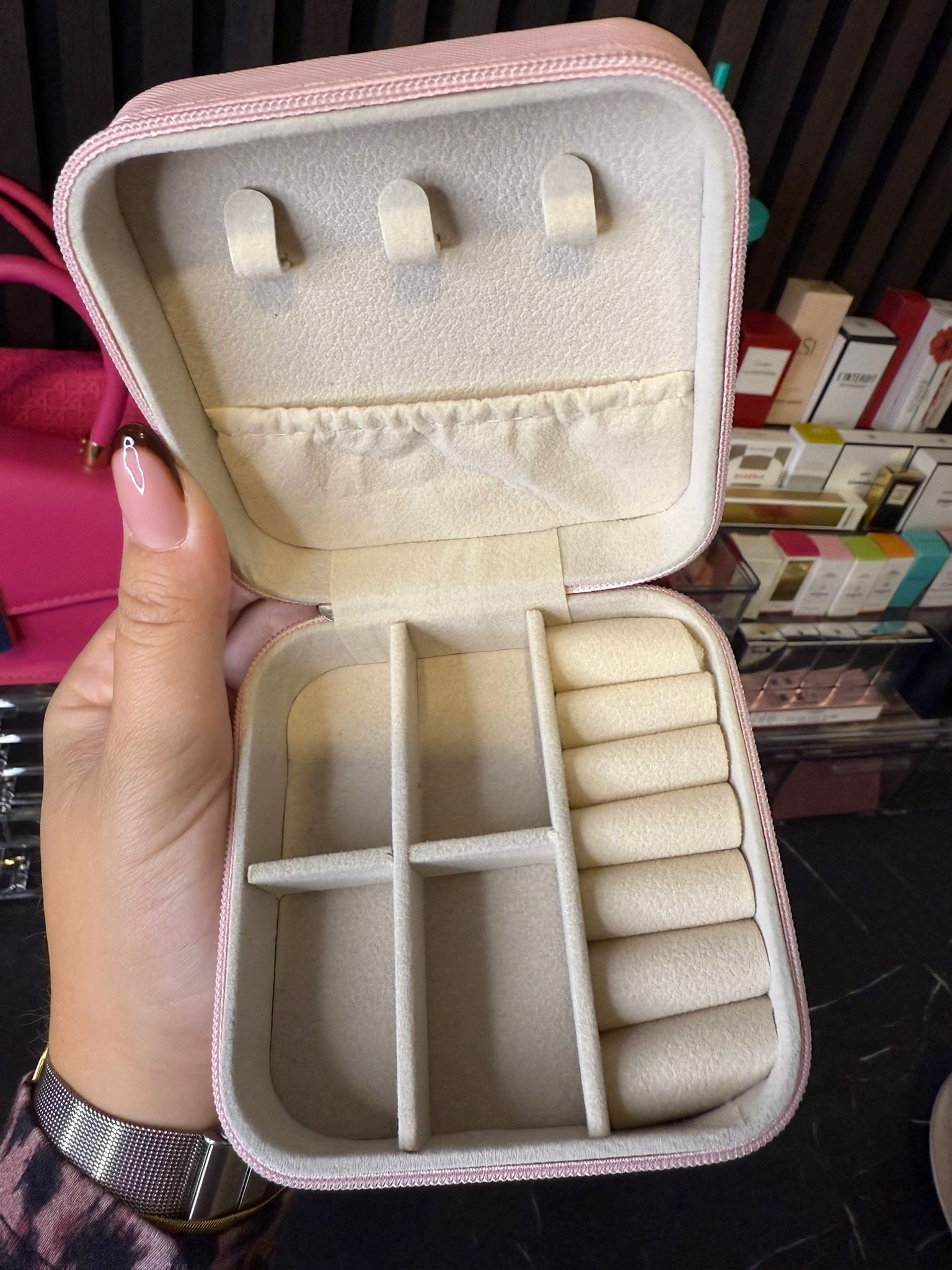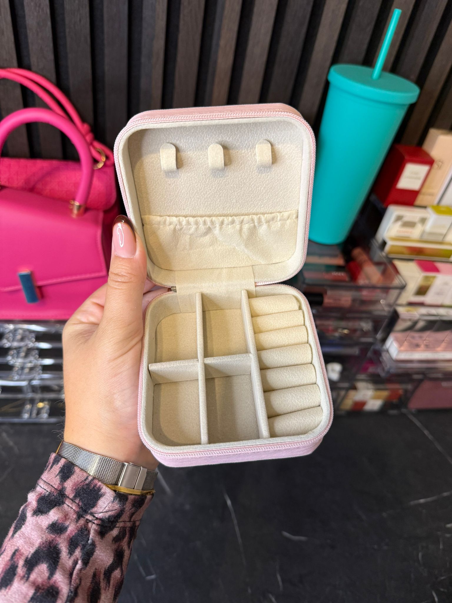 Bewaar je ringen, armbanden, oorbellen en kettingen overzichtelijk in deze stijlvolle sieradendoos. Met vakjes en haakjes voor 13 sieraden, compacte afmeting en een stevige rits. Ideaal voor thuis én op reis.